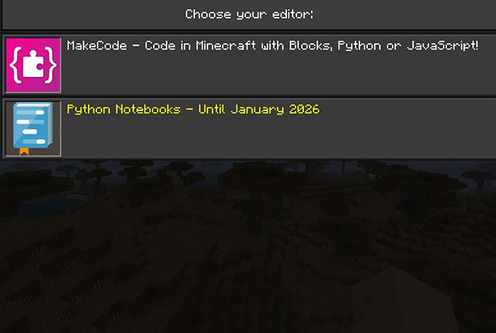 マインクラフト教育版には「コードビルダー」という機能があり、ビジュアルプログラミングやテキストプログラミングができます。