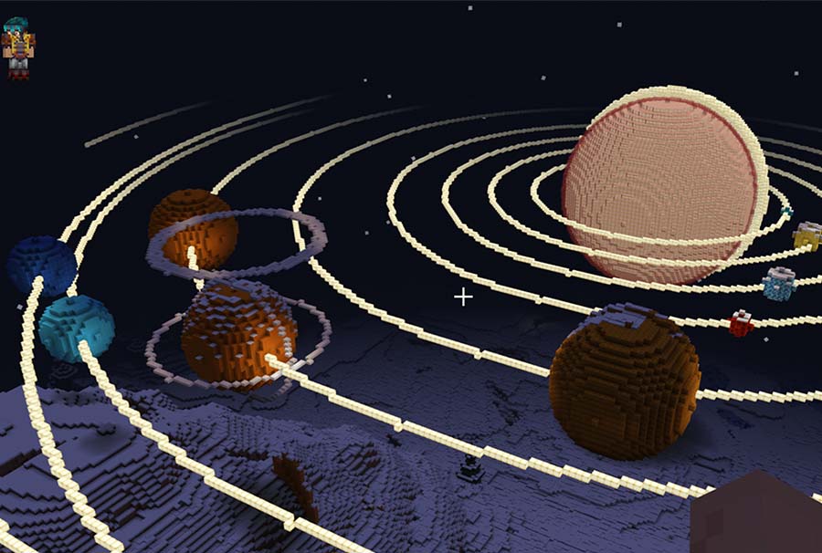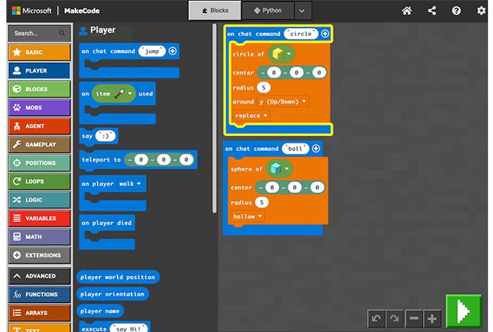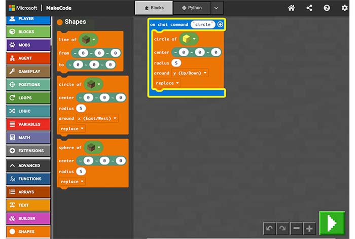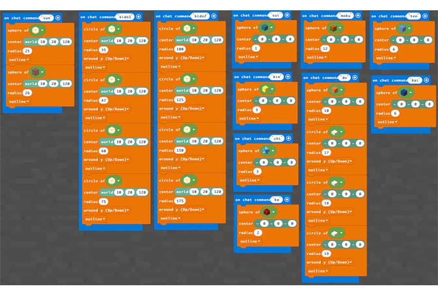 マインクラフト教育版のコードビルダーを使い、子どもたちと円と球をつくる練習をしました。